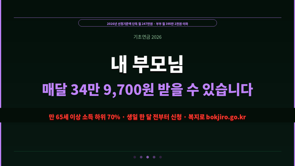 기초연금 만 65세 이상 소득 하위 70% · 매월 최대 34만 9,700원 지급 2026년 선정기준액: 단독가구 월 247만원 이하 /