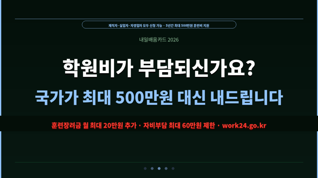 내일배움카드 재직자·실업자·자영업자 모두 신청 가능 · 1인당 최대 500만원 (5년간) IT·디자인·요리·미용·자격증 등 폭넓은 분야 훈련비 지원 · 수강료 일부 국가