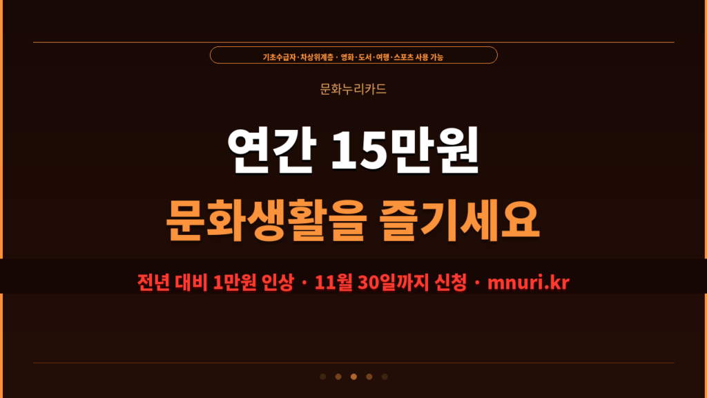 2026년 문화누리카드 1인당 연간 15만원 (전년 대비 1만원 인상) 청소년(13~18세)·준고령(60~64세)은 1만원 추가 → 최대 16만원 신청 기간 2026년 11월 30일까지