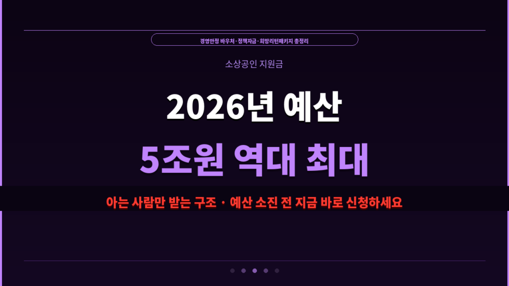 2026년 소상공인 지원 예산 5조원 이상 역대 최대 규모 · 직접 지원·융자·바우처 총망라 경영안정 바우처 25만원 · 정책자금 저금리 융자