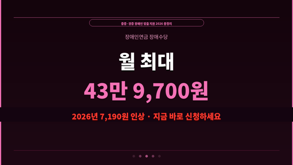 2026년 장애인연금 기초급여 월 34만 9,700원 (전년 대비 7,190원 인상) 부가급여 포함 월 최대 43만 9,700원 · 매월 20일 지급