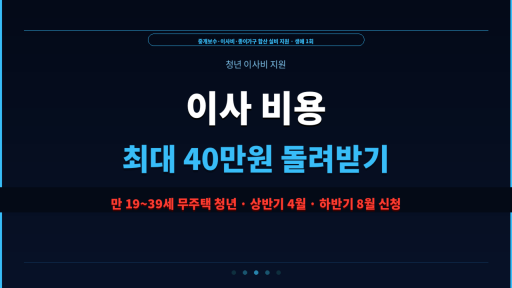 이사하면서 낸 중개보수·이사비, 최대 40만원까지 돌려받을 수 있습니다 서울시 기준 만 19~39세 무주택 청년 · 중위소득 150% 이하 · 생애