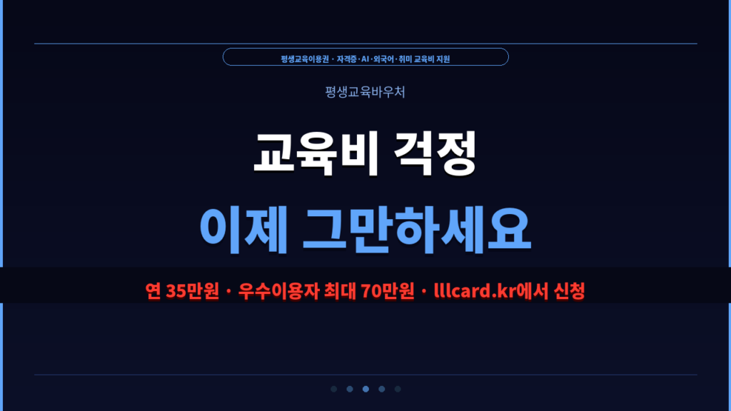 2026년 평생교육바우처(평생교육이용권) 연간 35만원 · 우수이용자 최대 70만원 일반형·AI디지털형·노인형·장애인형 4가지 유형 · 유형별 조건 상이 신청처: lllcard.kr · 콜센터 1600-3005