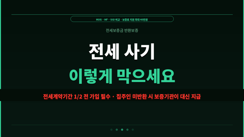 집주인이 전세금을 돌려주지 않아도 보증기관이 대신 지급하는 안전장치 HUG(주택도시보증공사) · HF(한국주택금융공사) · SGI(서울보증보험) 3개 기관 운영 보증료 최대 40만원 지원(국토부)